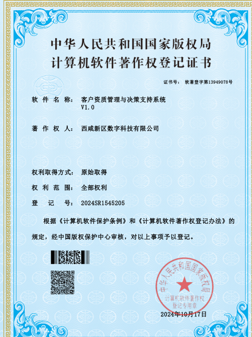 在西咸數(shù)科的全力推動(dòng)下,西咸新區(qū)供應(yīng)鏈金融服務(wù)平臺(tái)系統(tǒng)喜獲“企業(yè)資產(chǎn)池?cái)?shù)據(jù)分析軟件V1.0”“客戶(hù)資質(zhì)管理與決策支持系統(tǒng)”軟件著作權(quán),現(xiàn)已有各類(lèi)軟件著作權(quán)4項(xiàng),平臺(tái)技術(shù)底座進(jìn)一步夯實(shí),供應(yīng)鏈金融項(xiàng)目團(tuán)隊(duì)硬科技實(shí)力進(jìn)一步提升。